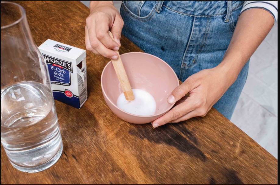 Gỗ công nghiệp và nhựa dễ bị ố, nhưng bạn có thể loại bỏ vết bẩn bằng cách trộn nước nóng và baking soda thành hỗn hợp sệt. Chà hỗn hợp này lên bất kỳ vết bẩn nào bằng bàn chải lông mềm.