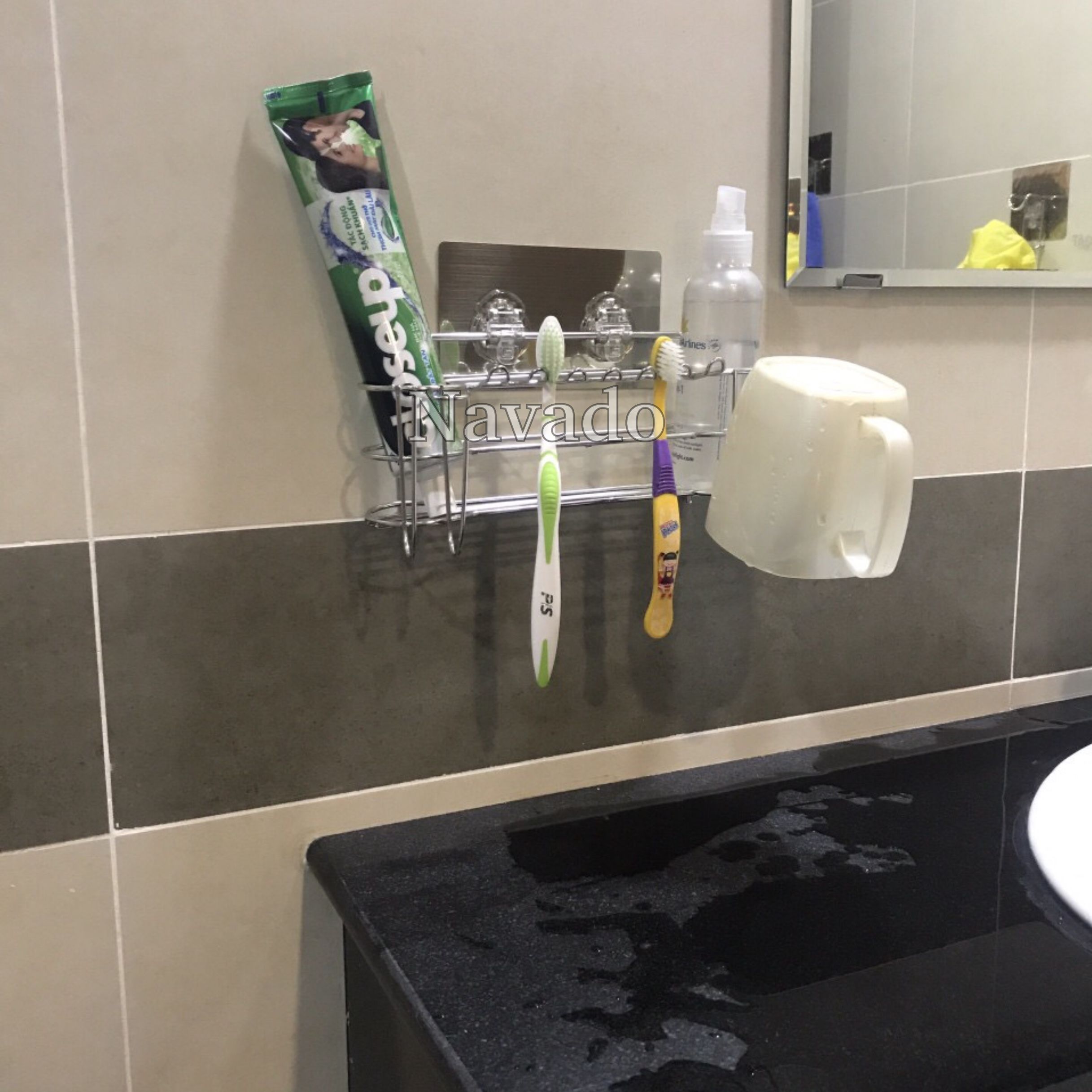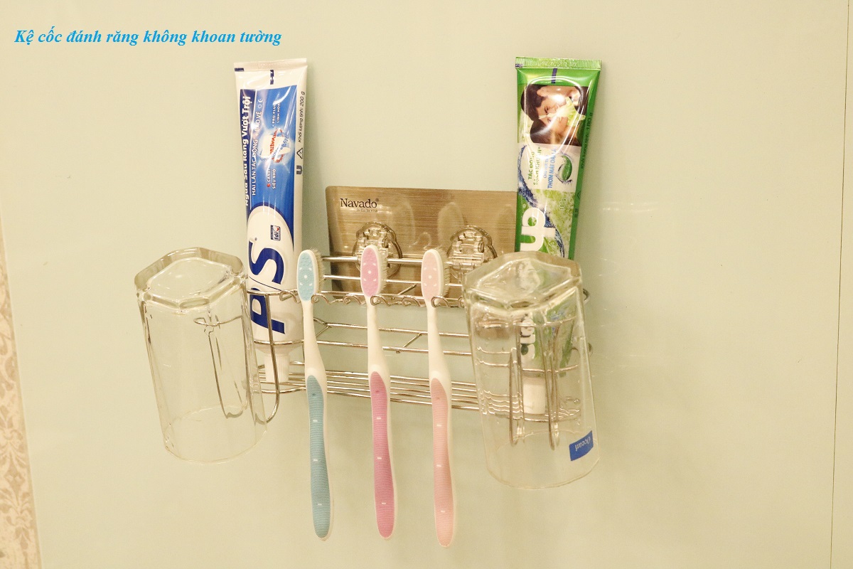 Kệ treo bàn chải inox dán không khoan tường navado được thiết kế để cài được bàn chải, tuýp kem đánh răng và úp cốc đánh răng tiện dụng