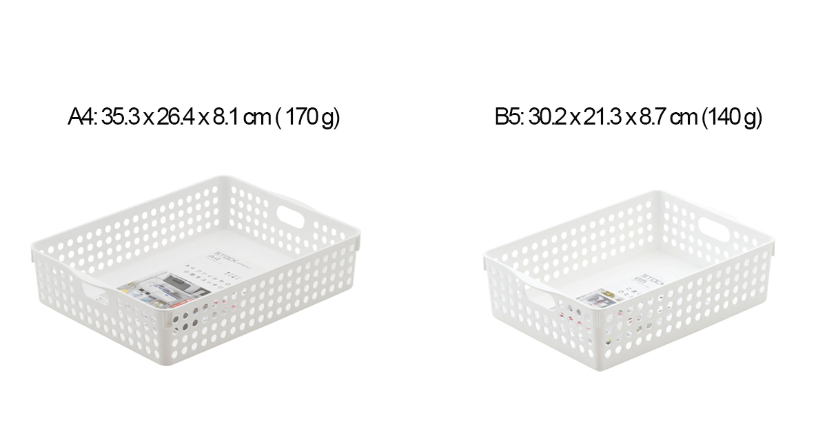 Rổ nhựa đựng đồ và phân loại đồ Inomata có 2 kích cỡ: A4 (35.3 x 26.4 x 8.1 cm) và B5 (30.2 x 21.3 x 8.7 cm).